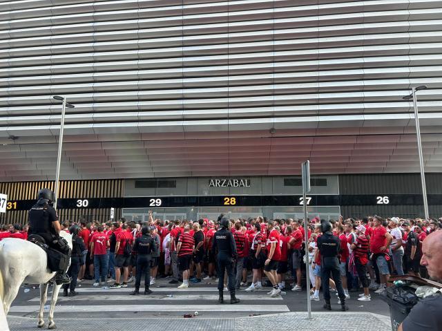 斯图加特上一次进入欧冠赛场要追溯到2009-10赛季,时隔14年再次出现在欧冠正赛,第一场比赛就是客场挑战欧冠之王皇马。德国球迷本就出了名的热爱远征,这一天马德里也不出意外地被斯图加特球迷“攻占”,中午时分起,马德里市中心的大街小巷就被成群结队的斯图球迷占据。《马卡》报表示,这一天来到马德里的斯图加特球迷大概有2万多人,但最终能出现在伯纳乌客队看台上的只能有4000人左右。伯纳乌客队球迷区在赛前也已经变成了红色海洋,大批斯图球迷高唱战歌涌入球场,声势一度压过了其余所有看台。